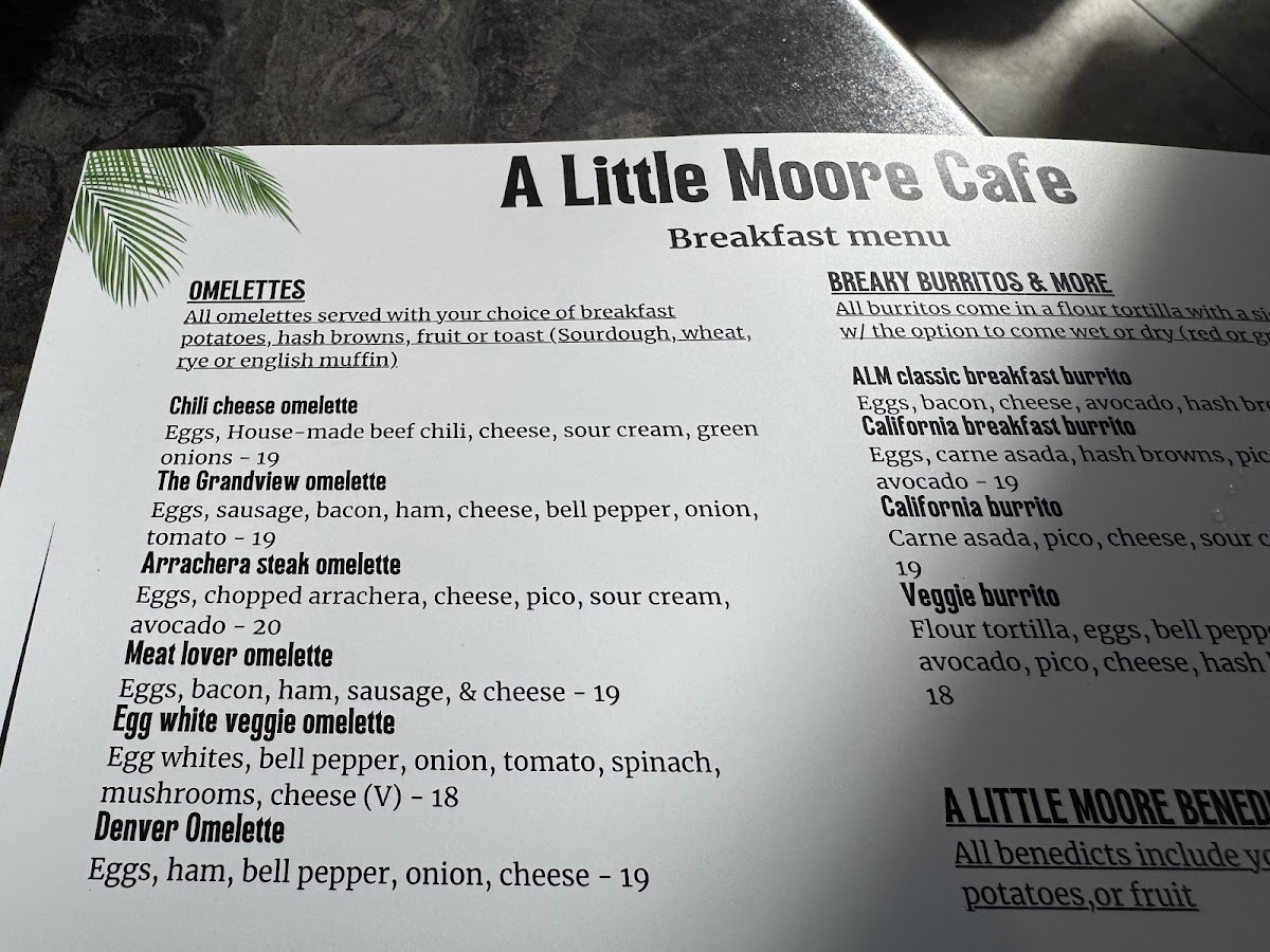 Guests often come here to savor hearty omelettes, like the Sausage and Cheese or the A Little Moore Everything Omelette, each served with crispy potatoes and toast that perfectly complement the flavors. The menu also features classic South-of-the-border influences with dishes like Chilaquiles and Huevos Rancheros, providing a satisfying start to the day or a fulfilling brunch experience.